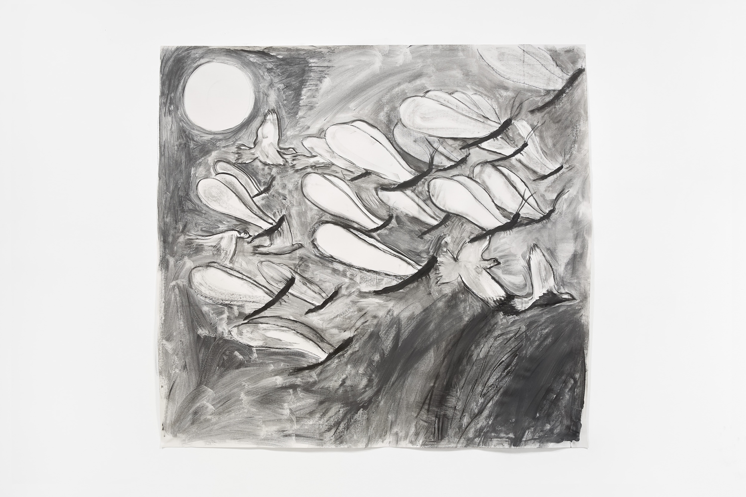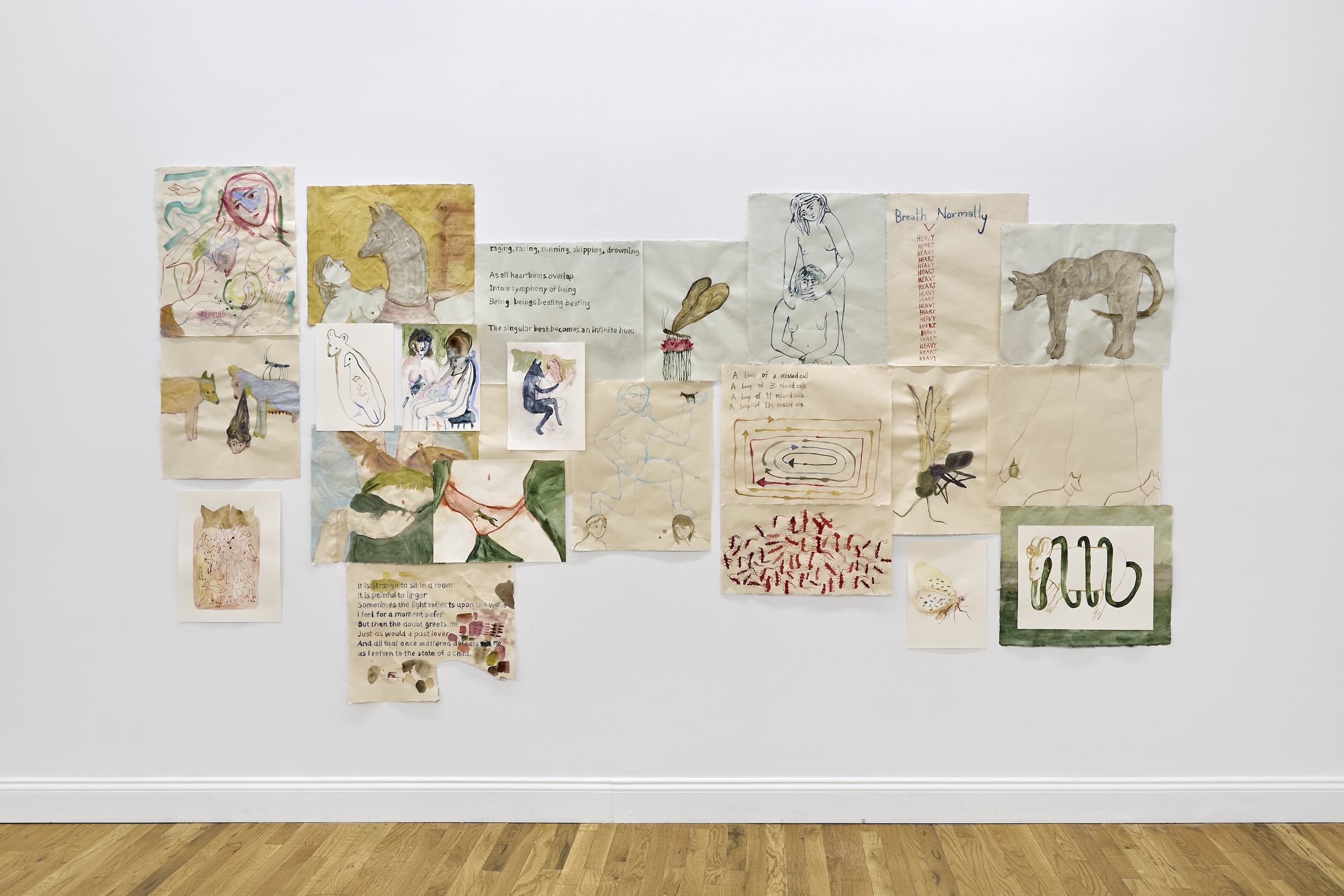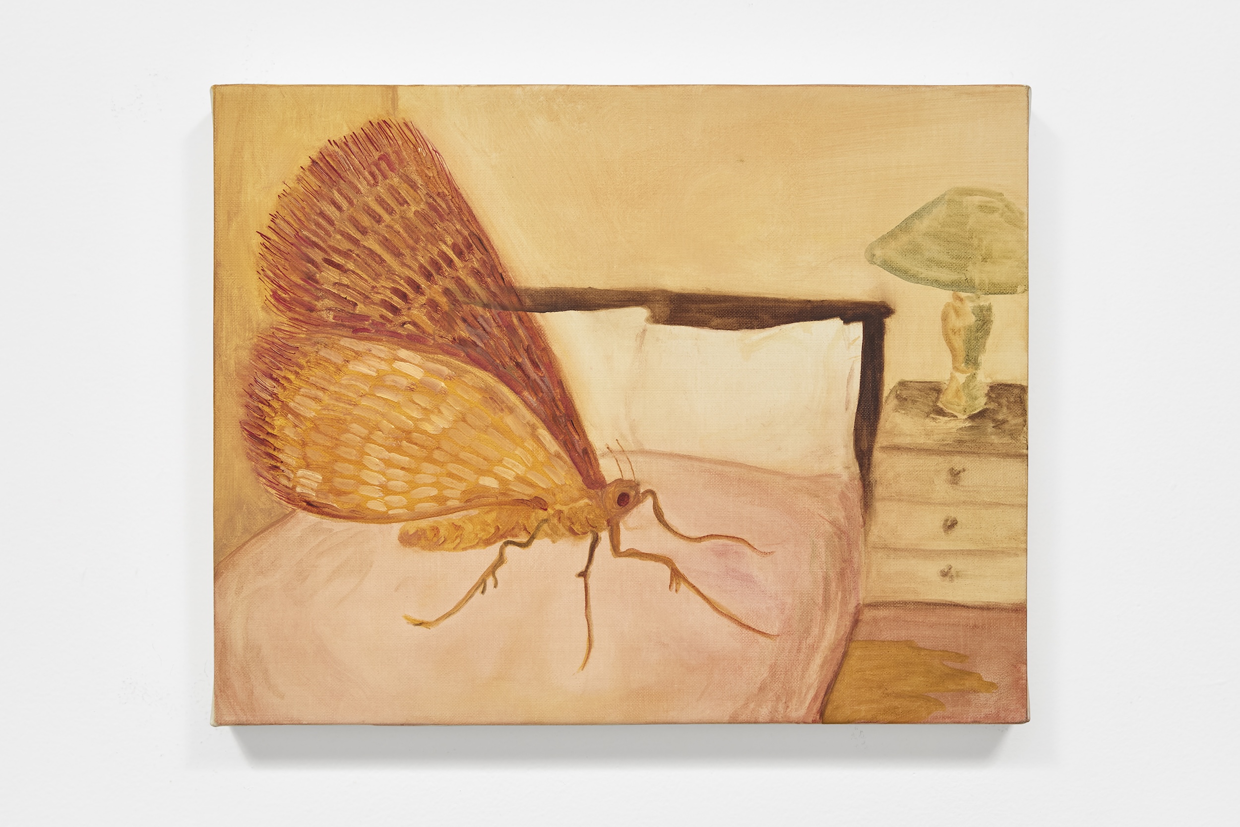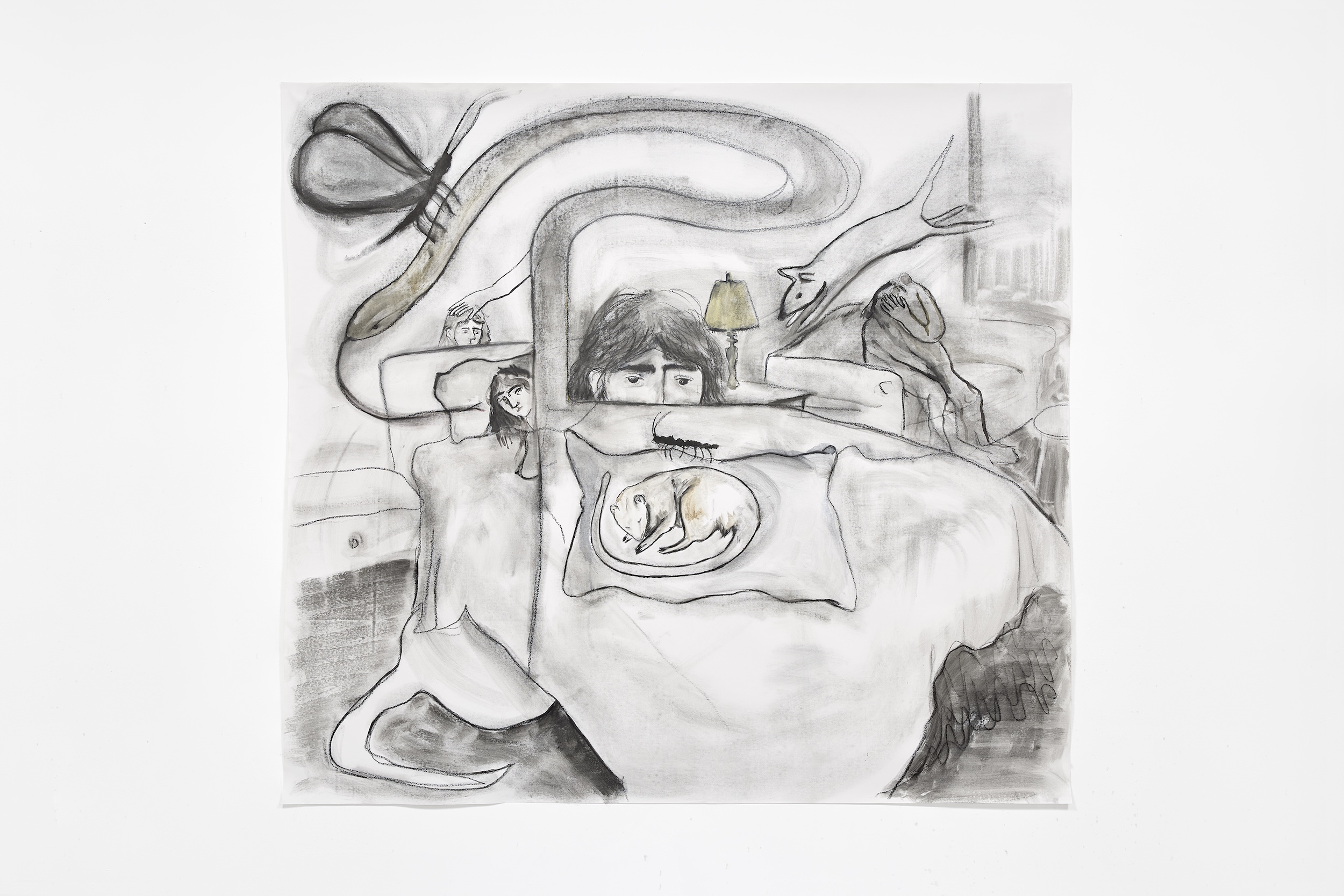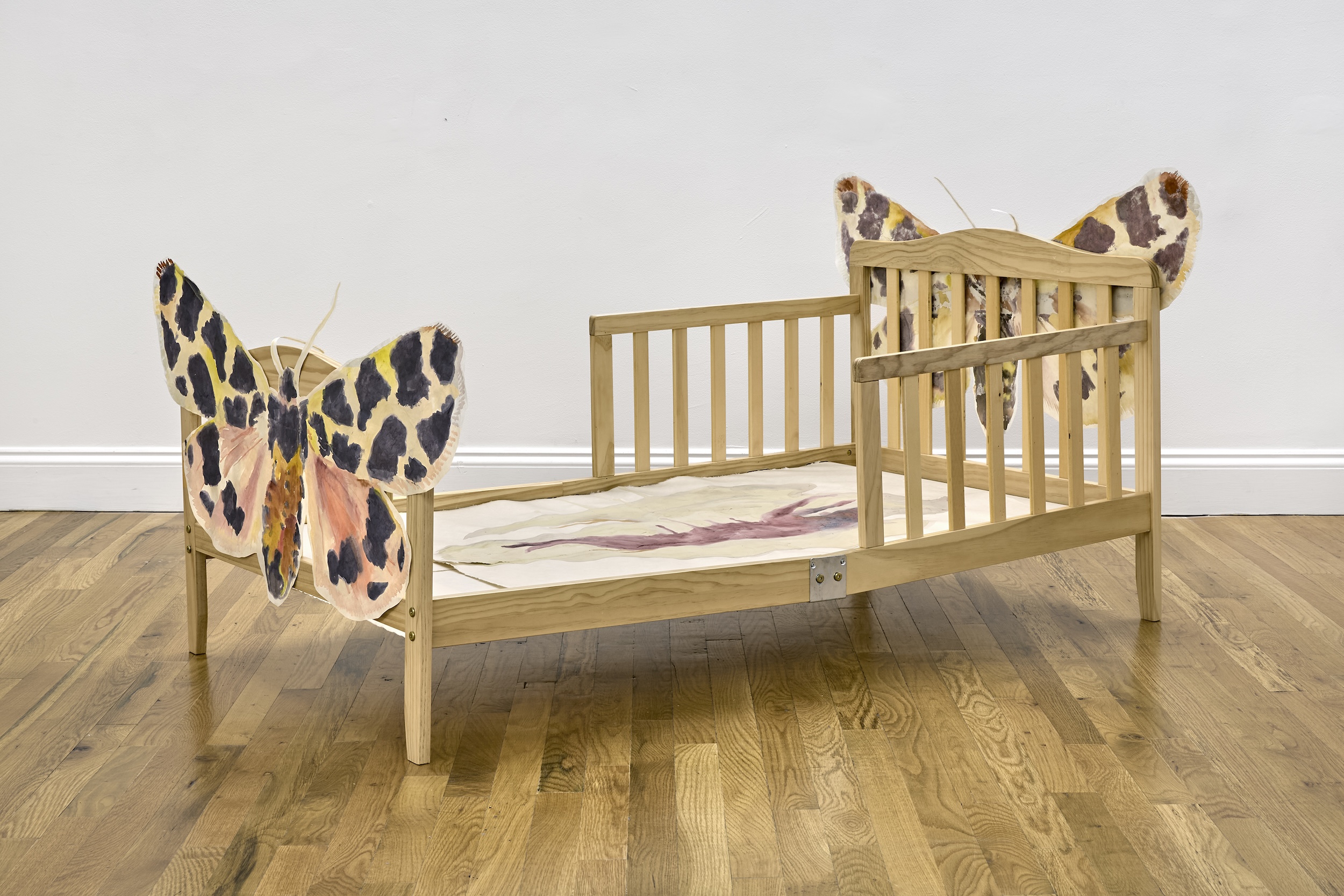 Her hybrid creatures resist fixed categories, collapsing distinctions between human and animal while tracing how relationships are fractured and reconfigured. The child’s bed flanked by moths embodies this site of protection and vulnerability, where tenderness is always shadowed by estrangement, and where mourning becomes inseparable from the possibility of transformation.