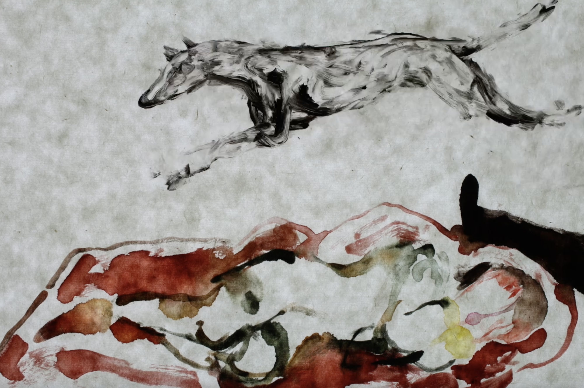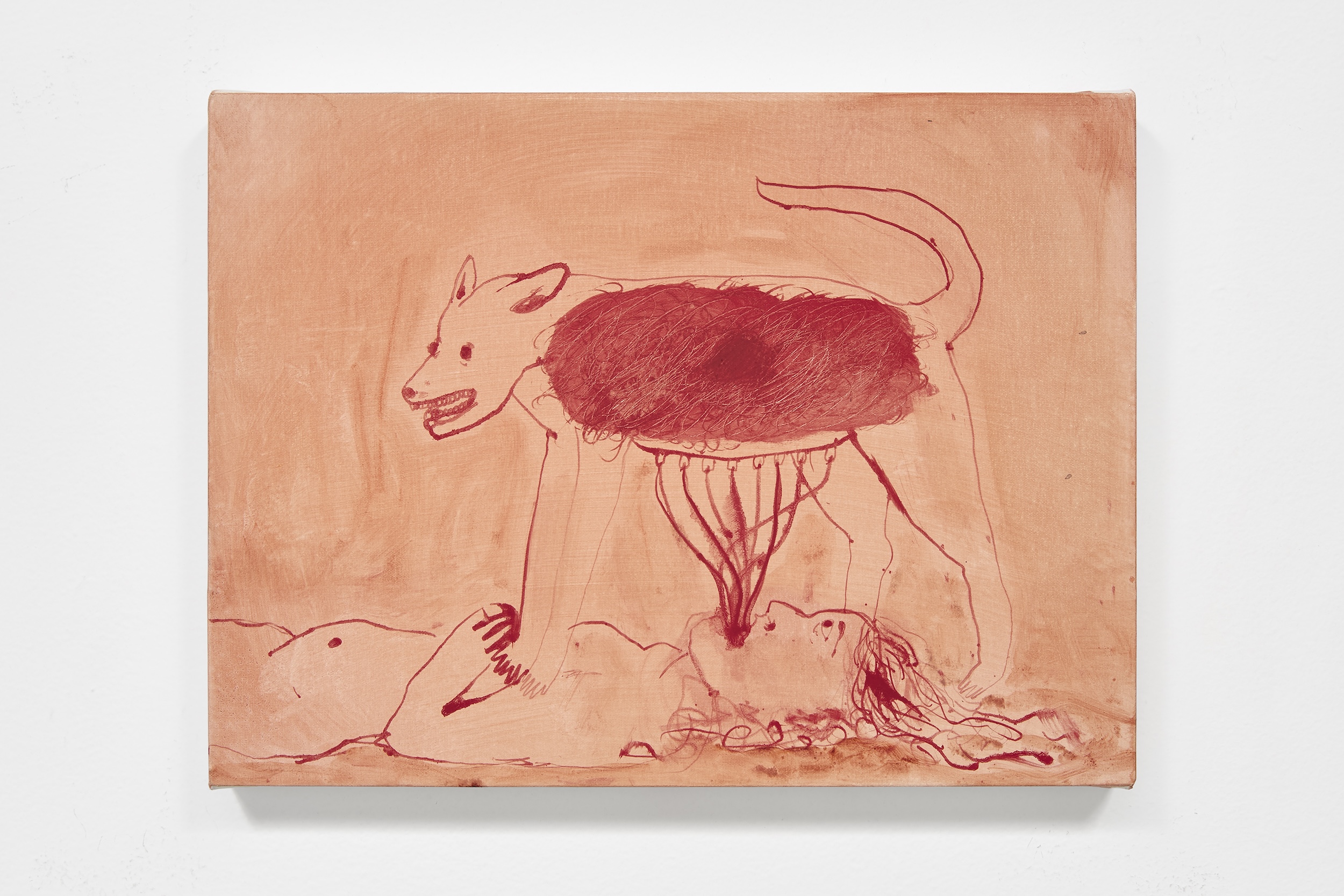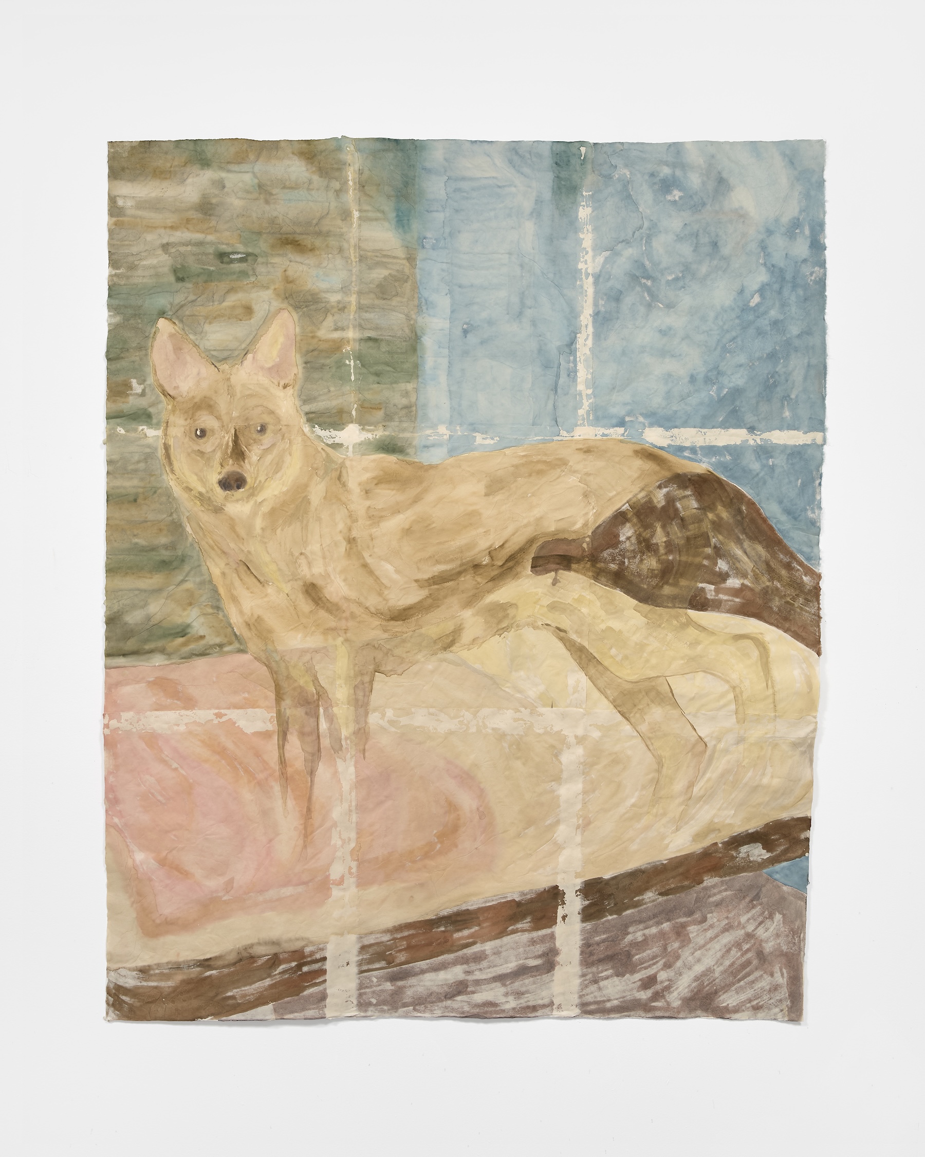 Among the works in the exhibition is a stop-motion animation, hand-painted frame-by-frame using watercolor on paper and oil on glass directly atop a light box. It brings to life a hybrid creature—part dog, part wolf, part human—that embodies both primitive innocence and emotional volatility. A dog runs. Two tongues touch. A wolf bares its teeth. A tail forms into a leash. These visual transformations raise questions about how ferality, rage, and vulnerability coexist.